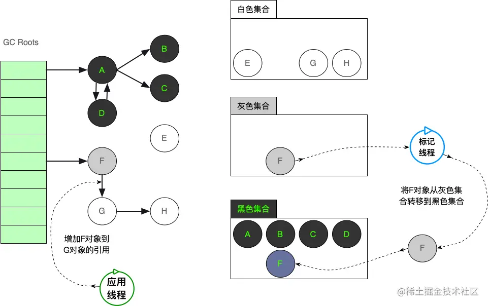 假设GC线程准备下一步标记工作前,对象的标记状态如上图。此时GC线程下一步将处理灰色集合中的F对象,由于F对象未引用任何对象其将直接移动到黑色集合中,整体个灰色集合为空标记结束。可是如果在GC线程还未完成F对象从灰色集合转移到黑色集合的操作时,应用线程正好增加了F对象对G对象的引用呢?