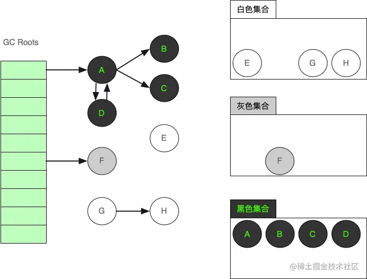 处理完灰色集合中的A对象引用的C对象与D对象后。此时A对象已从灰色集合移到黑色集合,C对象与D对象已从白色集移到灰色集合。