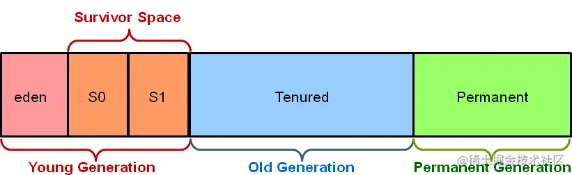 分代垃圾收集器将Heap划分为新生代(Young Generation)与年老代 (Old Generation),在JDK1.8 之前还有永久代(Permanent Generation)的概念。新生代又被进一步划分为Eden、From Space 、To Space,其中 From Space 与 To Space 大小相等又称作Survivor Spaces。