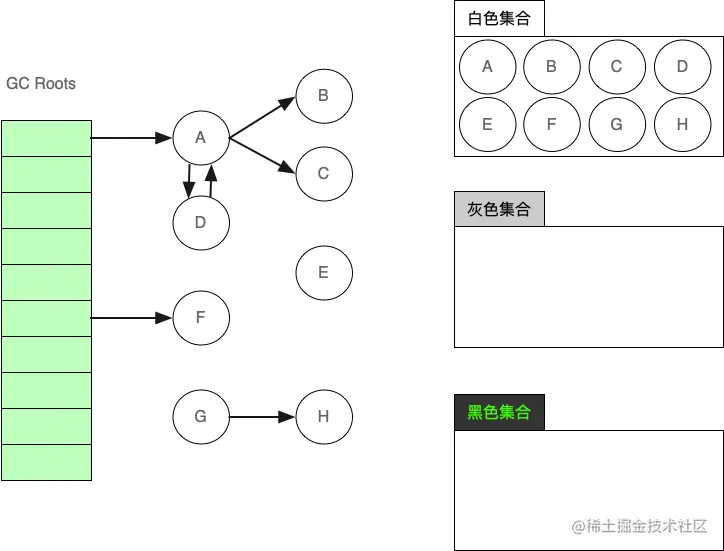 起初除了GC Roots内的对象外,其他对象全在右则的白色集合中。