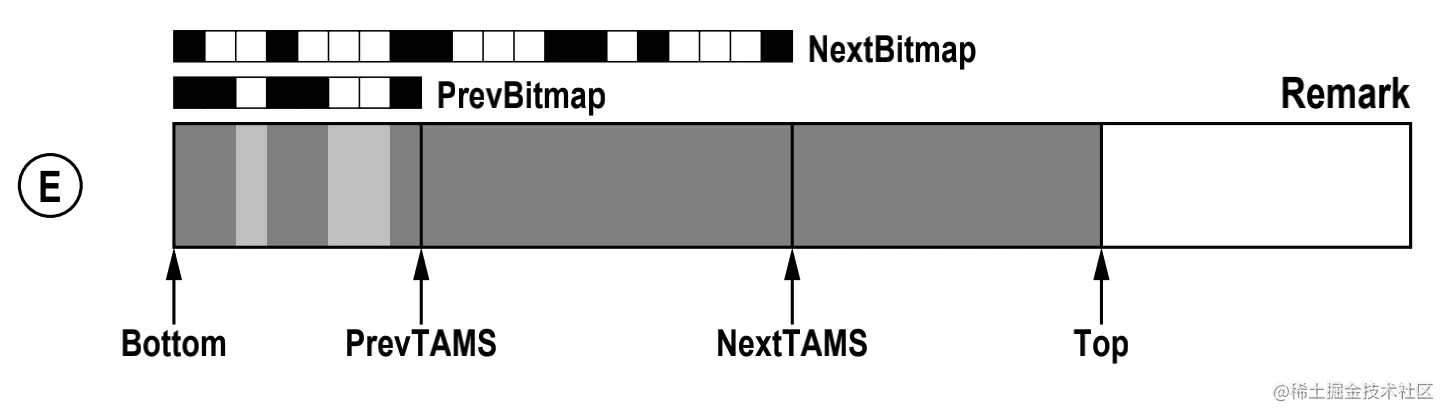 Remark 阶段,[PrevTAMS, NextTAMS)区间的存活对象与垃圾对象被标记出来,NextBitmap发生改变其中黑色部分表示标记出来的存活对象,白色部分为垃圾对象。同时由于应用程序生成了新的对象,Top指针的位置从NextTAMS指针处向右移动了。