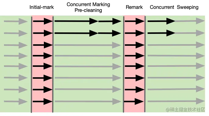 上图灰色箭头为应用线程,而黑色箭头为GC线程,CMS在Initial-mark阶段开启多个GC线程对GC Root进行标记,该阶段通常时间会比较短。CMS在并发标记与并发预清除阶段同会开启多线程工作,该阶段GC线程与应用线程并发工作。上图中Concurrent Making Pre-cleaning 阶段中长的黑色箭头代表处理Concurrent Making工作的GC线程,短的黑色箭头代表处理Pre-cleaning工作的线程。CMS在重新标记同样开启多个GC线程并且与Initial-mark阶段一样会SWT。CMS在并发清除阶段GC线程与应用线程并发工作。