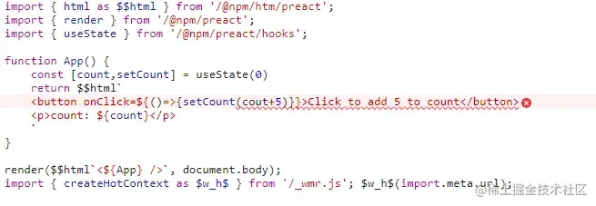 count 在 onClick 处理函数中拼写错误,因此会报错。通常,我们将不得不依靠我们的工具和源映射来收集有关错误所在位置的信息,但 wmr 采取了不同的解决方案。如果使用 htm,会可能接近原生 JSX 写法,所以编写 React 或 Preact 代码的地方通常是这样的: