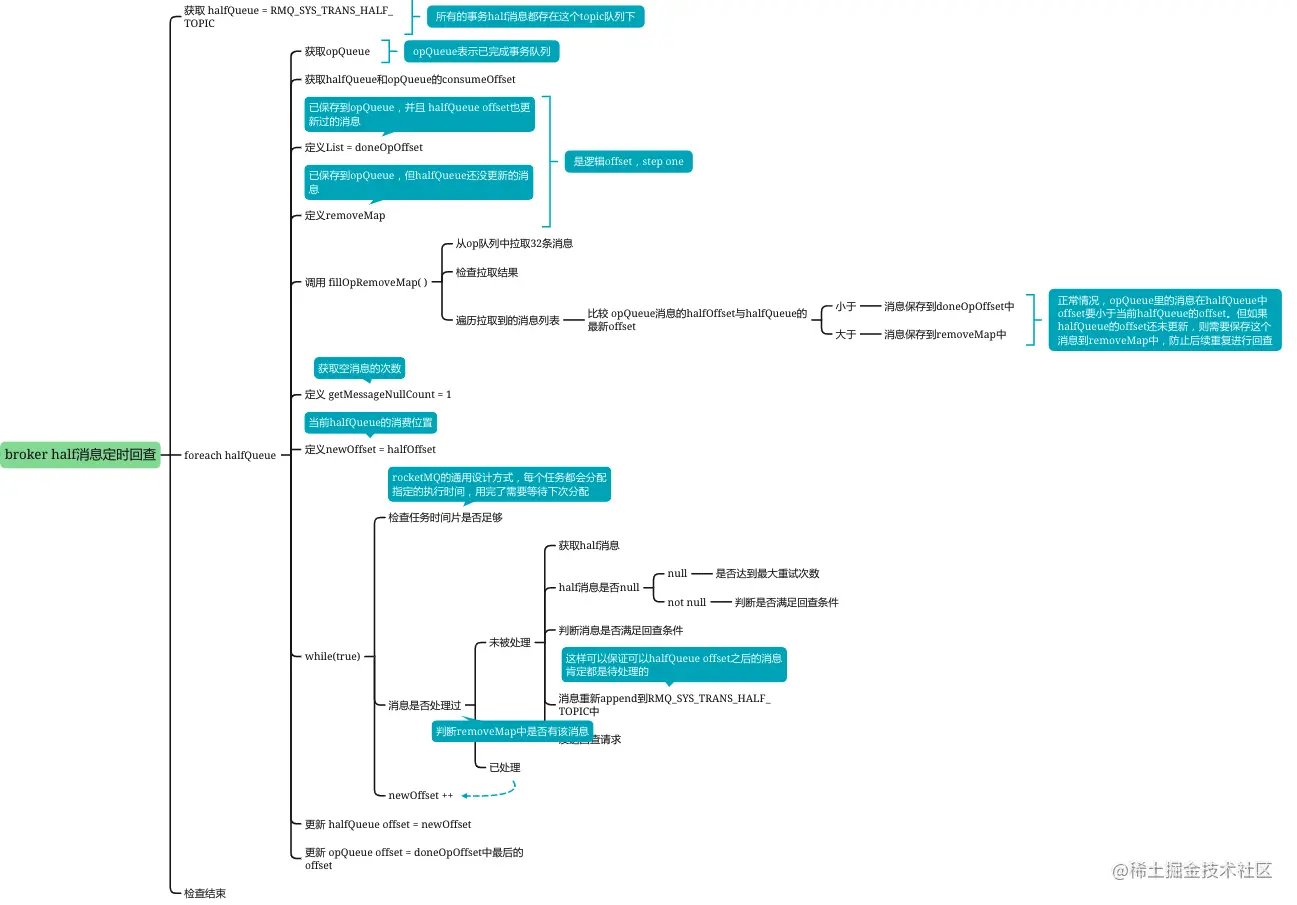 RMQ_SYS_TRANS_OP_HALF_TOPIC队列,保存已处理过的消息。 - halfOffset : halfQueue 中的消费记录位置,可以保证的halfOffset之后的消息才需要进行回查操作