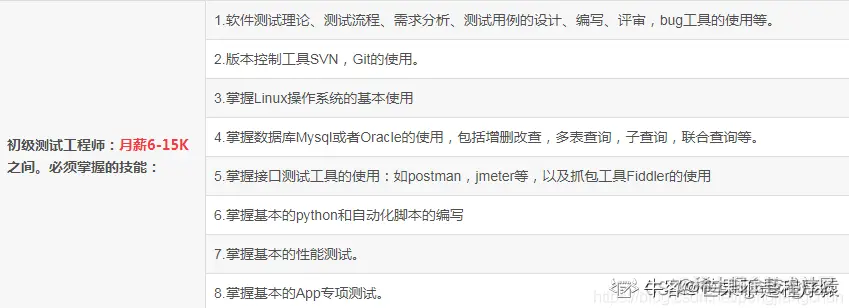 2021年市场上面对软件测试工程师的要求使必须要掌握上图的第1-5条,第6-8条稍微了解一下就可以了!如果你都会了话在一线城市工资大概在6-12K之间!看你个人的能力了!奔跑吧,骚年,升职加薪,迎娶白富美就在前面等着你!