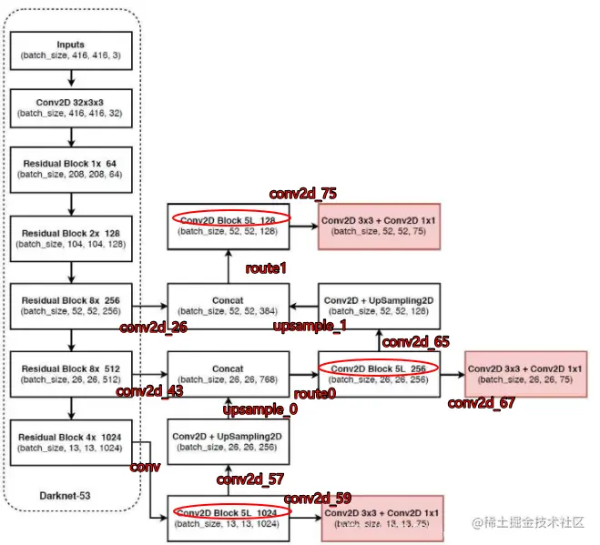 我对他的框图加了注释,便于理解,红色圈为yolo_block,深红色注解为前一模块的输出,请对照代码