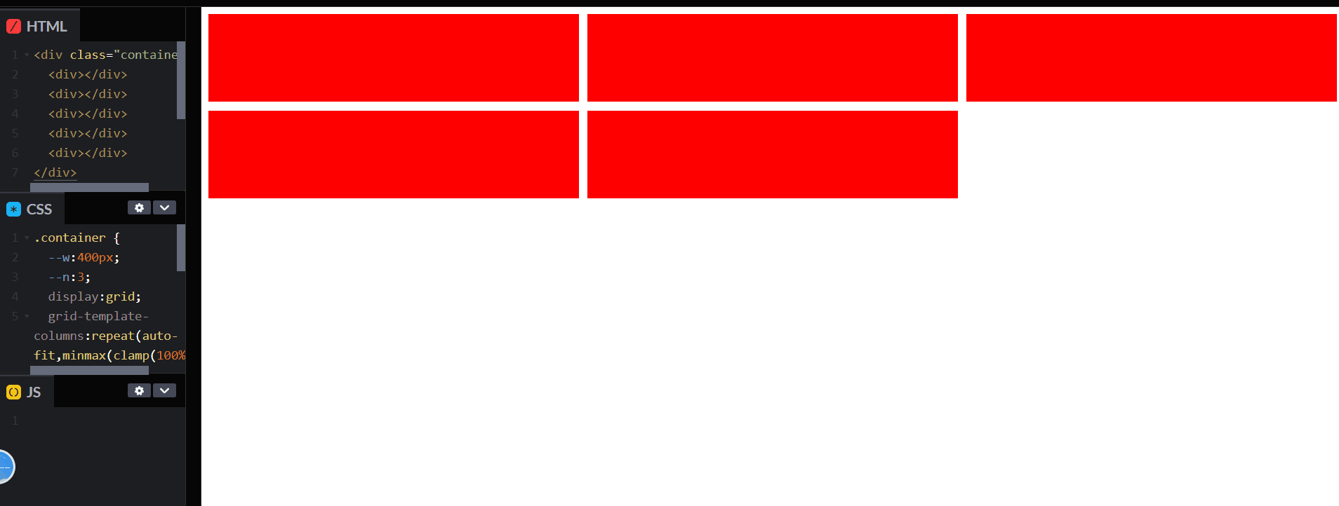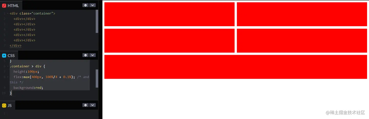 让我们以第一个示例为例,更改flex: 400px为flex: max(400px, 100%/3 - 20px),