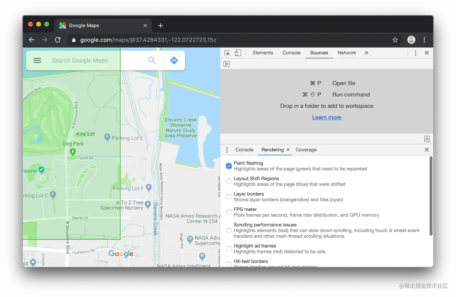 打开Rendering的一种方法是在开发者工具的更多选项中,找到rendering并点选上Paint flashing。