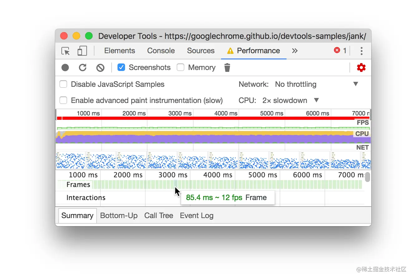 - Performance 占用的时间是不会被计算在内的,Disable JavaScript sample 将会减少总耗时,但同时也不会看到单个JS脚本耗时