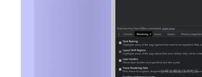 请注意,上面的红线表示正在发生布局偏移。启用“Layout Shift Regions”后,请注意渐变始终以紫色突出显示 - 它会导致每帧布局偏移: