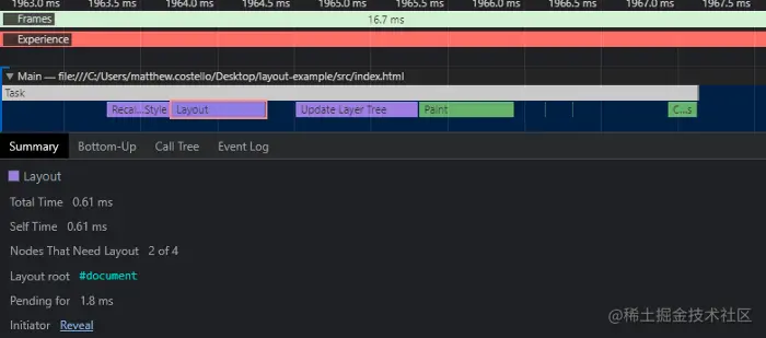 尽管每帧都触发了回流,但它实际上不太可能降低浏览器的速度以影响您的帧速率。我已经限制了我的 CPU 以使其更加引人注目。请记住,这是一个非常小的示例;基本上没有多少东西需要计算。对于复杂的应用程序,就会看到切实的影响——尤其是低端设备。