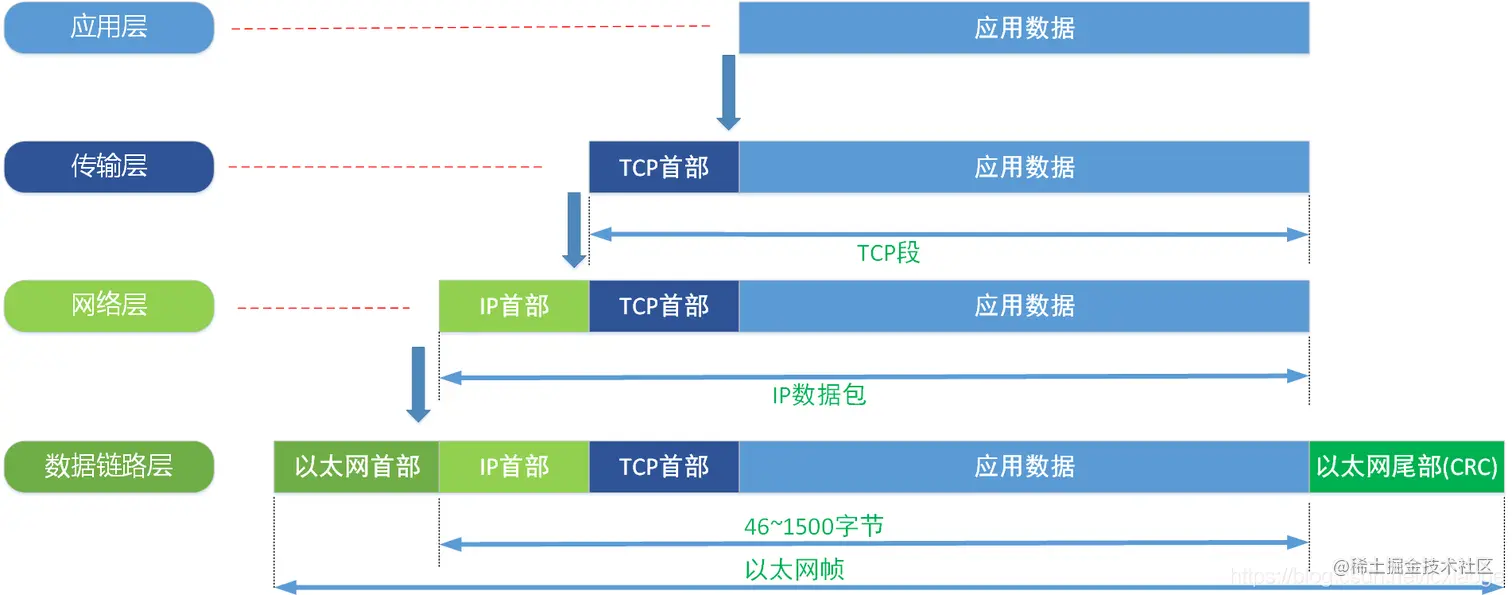当我们应用程序用TCP传输数据的时候,数据被送入协议栈中,然后逐个通过每一层,直到最后到物理层将数据帧转换成比特流,送入网络。而在这个过程中,每一层都会对要发送的数据加一些首部信息。整个过程如下图,每层数据向下传输时都会进行封装,帧有效数据来源于上级网络层。
