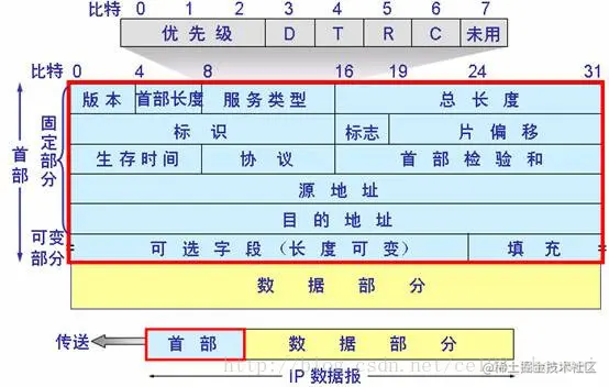 传输层的数据(TCP段)传给网络层,网络层添加IP报头得到的PDU被称为Packet(数据包); 图示为IP数据包