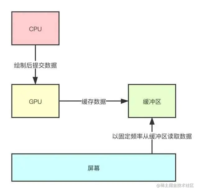 总结一句话就是:CPU 绘制后提交数据、GPU 进一步处理和缓存数据、最后屏幕从缓冲区中读取数据并显示。