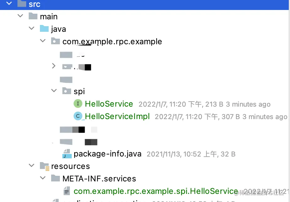 META-INF/services/目录下,创建一个以接口全路径命名的文件,如com.example.rpc.example.spi.HelloService。 - 文件内容为具体实现类的全路径名,如果有多个,则用分行符分隔。
