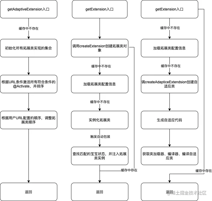 获取Activate扩展类实现,也是通过getExtension得到的。因此,可以认为getExtension是其他两种Extension的基石。