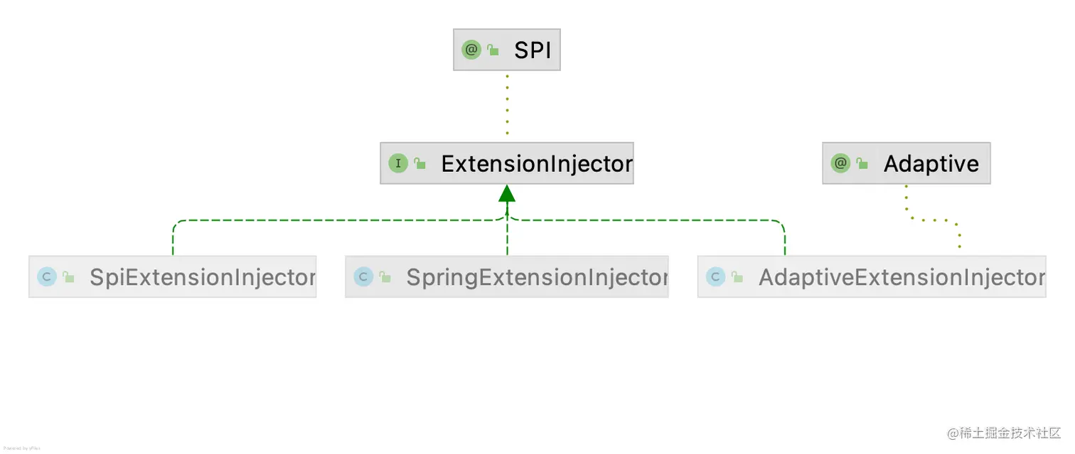 既然注射接口有多个实现,那么是怎么确定使用哪个注射类实现的呢?我们可以看到 AdaptiveExtensionInjector 这个实现类工厂上有@Adaptive 注解。因此,AdaptiveExtensionInjector 会作为一开始的默认实现。注射类之间的关系如图