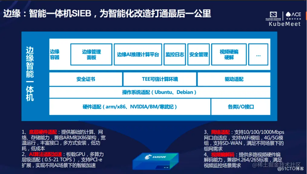 它里面提供了很多功能,包括控制面板,AI 算法的平台,以及监控日志的收集,当然还有最重要的安全网络管理,以及一些视频的解码编码。同时这个盒子也是支持硬件适配的,比如 arm 架构、x86 架构,还包括不同的网络 GPU 的配合、底层数据操作系统适配。