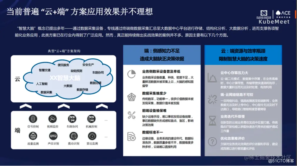 对于一些传统行业而言,他们的云计算可能是很小的,比如市面上有很多私有云场景、政府专有云场景,他们不足以做到像大厂商那些云计算一样无限的扩容来做很多计算处理。目前的市场环境下,云和端的环境非常不理想,主要原因有以下几个方面。