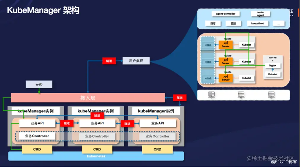它主要分为两个大的模块,上图左下方是管理集群,前文提到的一系列内容都是在管理集群里去承接的。用户集群可以通过接入层来进行数据接入,然后将 API 的数据发送到 API 业务层,再把这些数据存储到原生 K8s 的 etcd 里面去。