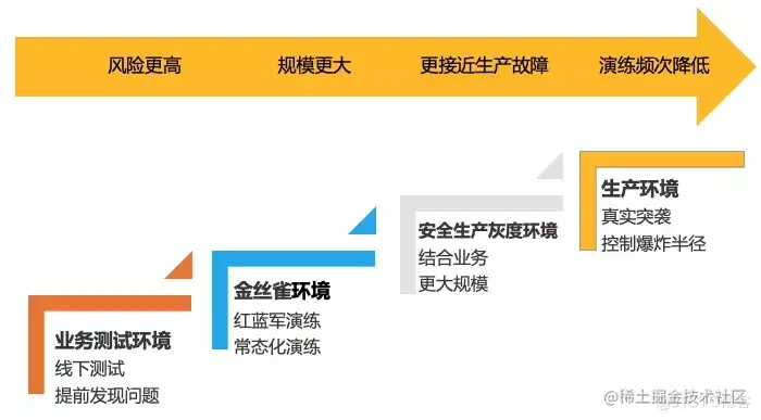 故障演练一般会开始在金丝雀环境引入,可以在全链路、无真实流量的环境中做一些高可用能力的建设和验收,常态执行的演练,在这个环境演练多次的场景,可定期在灰度环境和生产环境中、控制爆炸半径的前提下进行真实突袭,作为能力的验收。