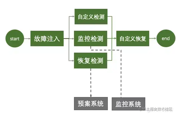 常态化执行: 演练进行到下一阶段,我们会有更高的要求,希望演练可以自主混沌化执行,以无人值守的方式进行,这又对系统的高可用能力有了新的挑战。这要求系统有不仅有监控告警可以发现故障,也有对应的预案模块来负责恢复,而要做到无人值守,需要系统进行更智能精确的判断故障情况,自动执行相应预案。