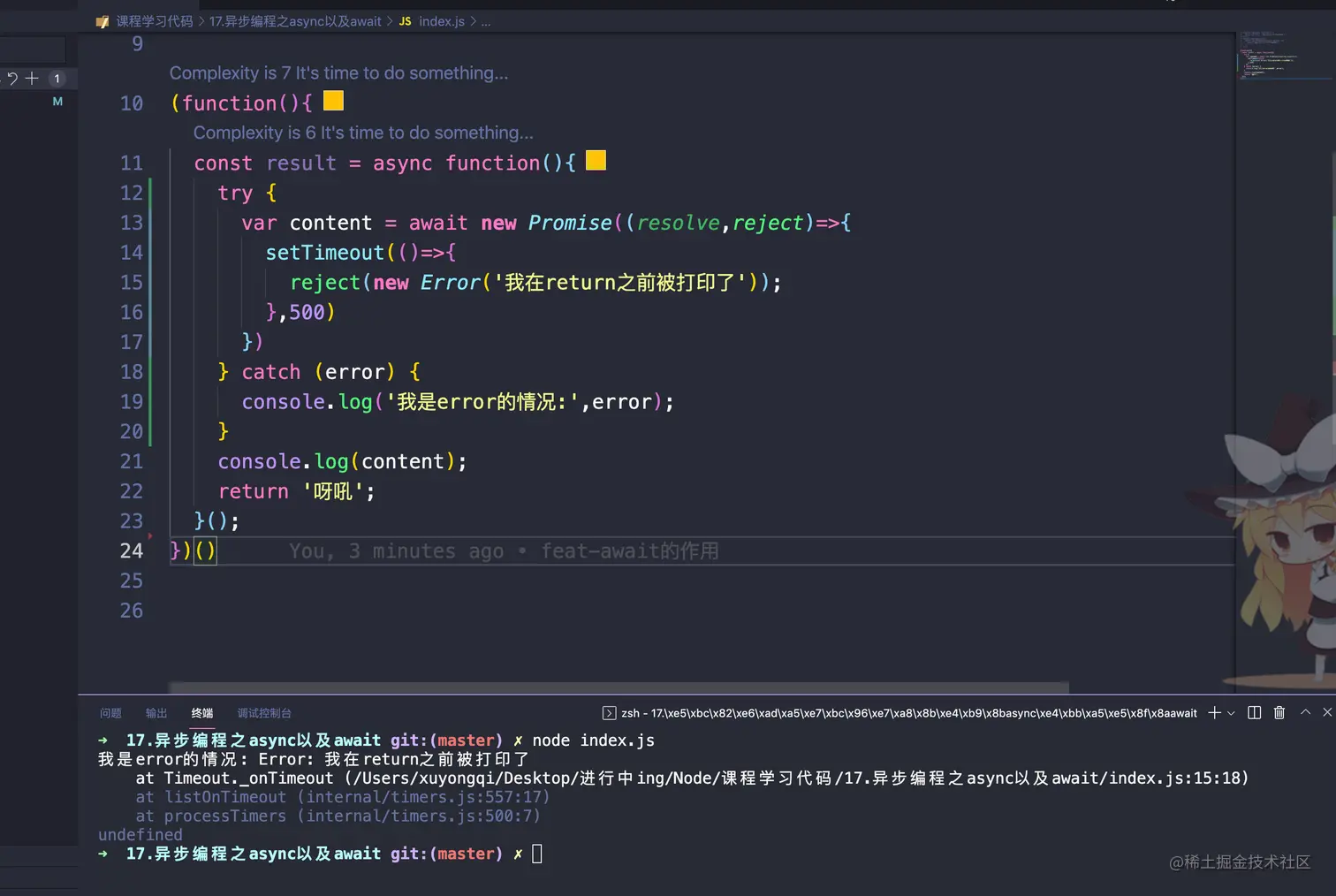 await关键字可以暂停 async function的执行await关键字可以以同步的写法获取Primise的执行结果try-catch可以获取await所得到的结果