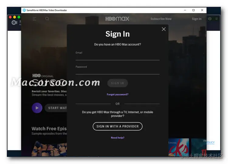 在 Mac 上启动 SameMovie HBOMax 视频下载器,在搜索栏中输入任何单词,然后按“Enter”按钮。您将被要求使用您的帐户登录 HBO Max。