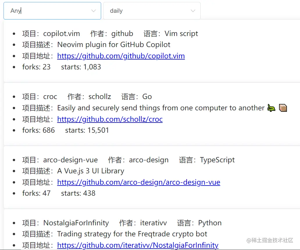 相信很多开发者都有逛 GitHub 的习惯,会去看 GitHub Trending,关注每个时段 GitHub 上面的热门项目和热门的开发者,但是访问 GitHub 的时候可能会遇到速度比较慢的问题;另外,我们在开发第三方 GitHub 应用时,通常也需要展示 Trending 数据,由于 GitHub 官方提供的 API 并不包含 GitHub Trending 相关的接口,如果直接在客户端抓取解析,可能速度会比较慢。所以编写了一个基于 Java 的小爬虫,用于在服务器端抓取解析 GitHub Trending 数据并缓存,以提供给客户端快速(秒级)的查询接口。可以分别以编程语言(Java、Python、Go、C...)和时间(Daily、Weekly、Monthly)为维度抓取最受关注的 Repositories 和 Developers。