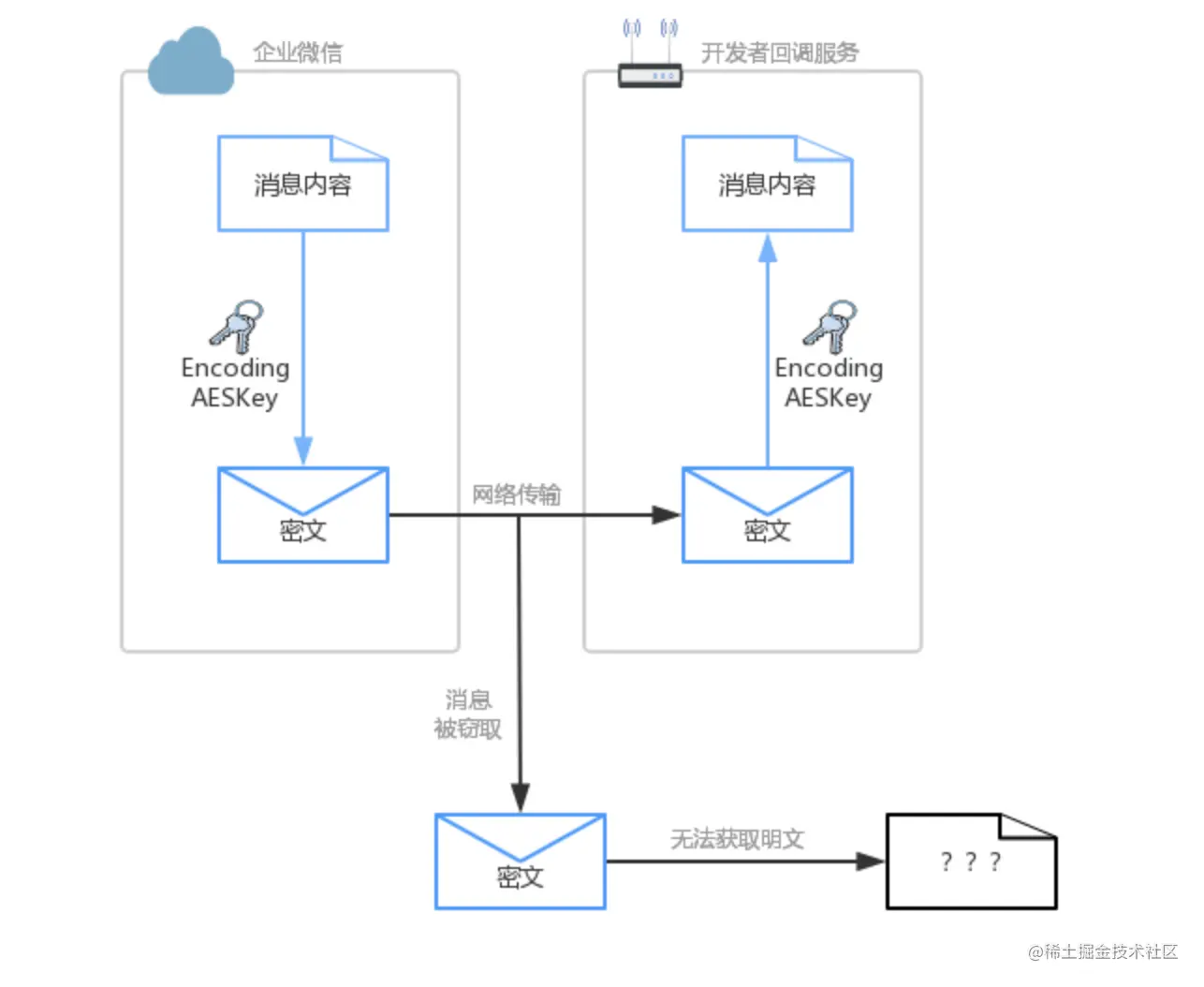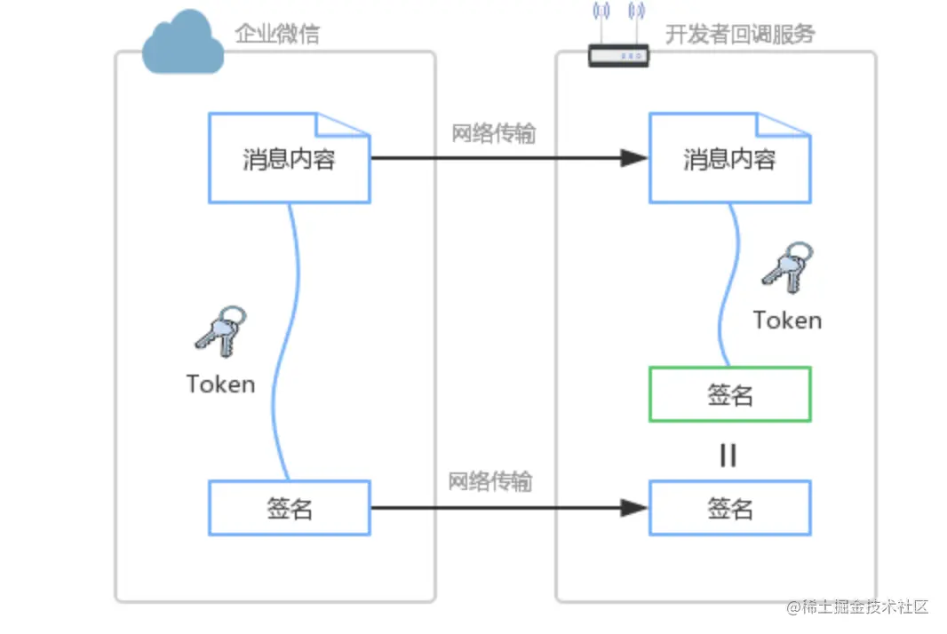 如何分辨出是否为企业微信来源 如何分辨出推送消息的内容是否被篡改 通过数字签名就可以解决上述的问题。具体为:约定Token作为密钥,仅开发者和企业微信知道,在传输中不可见,用于参与签名计算。企业微信在推送消息时,将消息内容与Token计算出签名。开发者接收到推送消息时,也按相同算法计算出签名。如果为同一签名,则可信任来源为企业微信,并且内容是完整的。