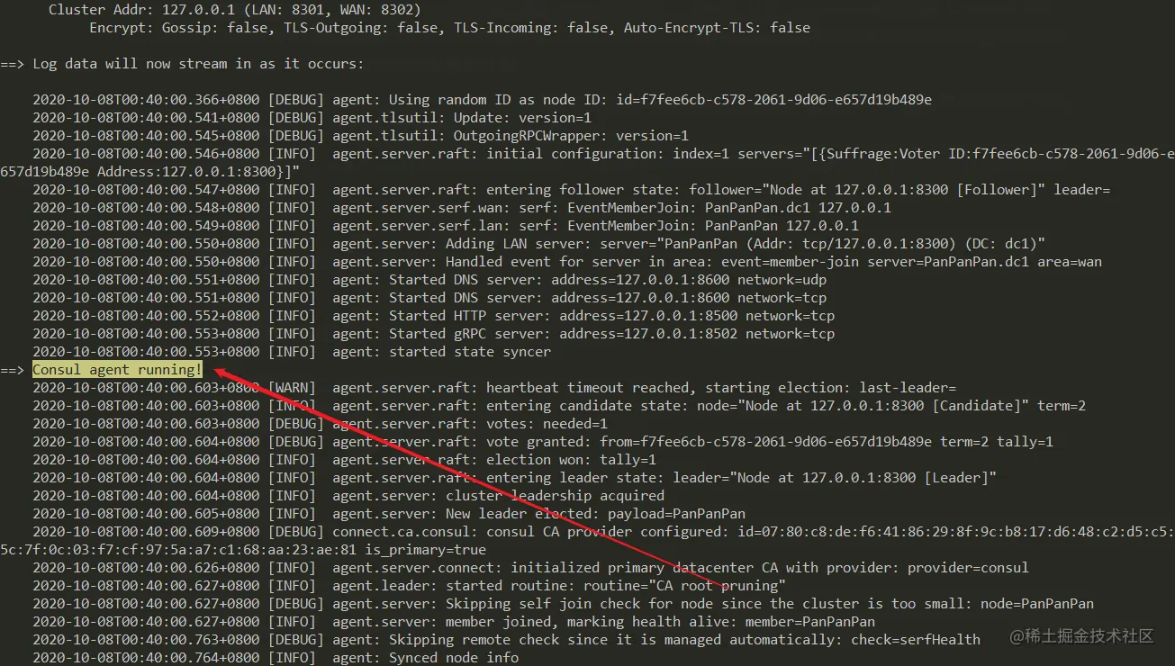 执行后如果看到了Consul agent running!则代表运行成功