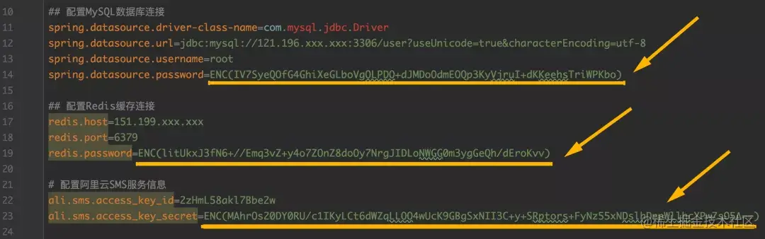 我们拿到上一步得到的加密结果,将配置文件中的原始明文密码替换成上一步对应的结果即可,就像这样: