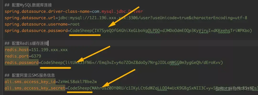 比方说,我们提前设置好系统环境变量JASYPT_ENCRYPTOR_PASSWORD = CodeSheep,则直接在Spring Boot的项目配置文件中做如下配置即可: