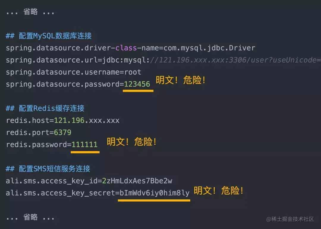 是的! 很多项目的配置文件里,包括数据库密码、缓存密码、亦或是一些第三方服务的Key都是直接配在里面,没有做任何加密处理!