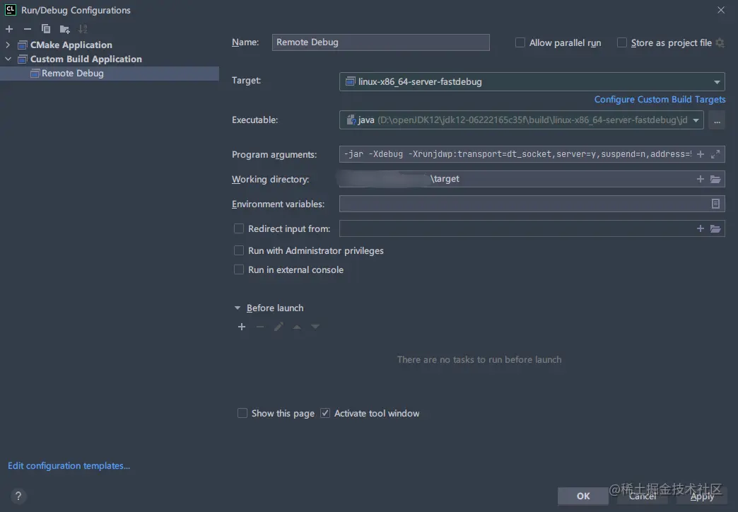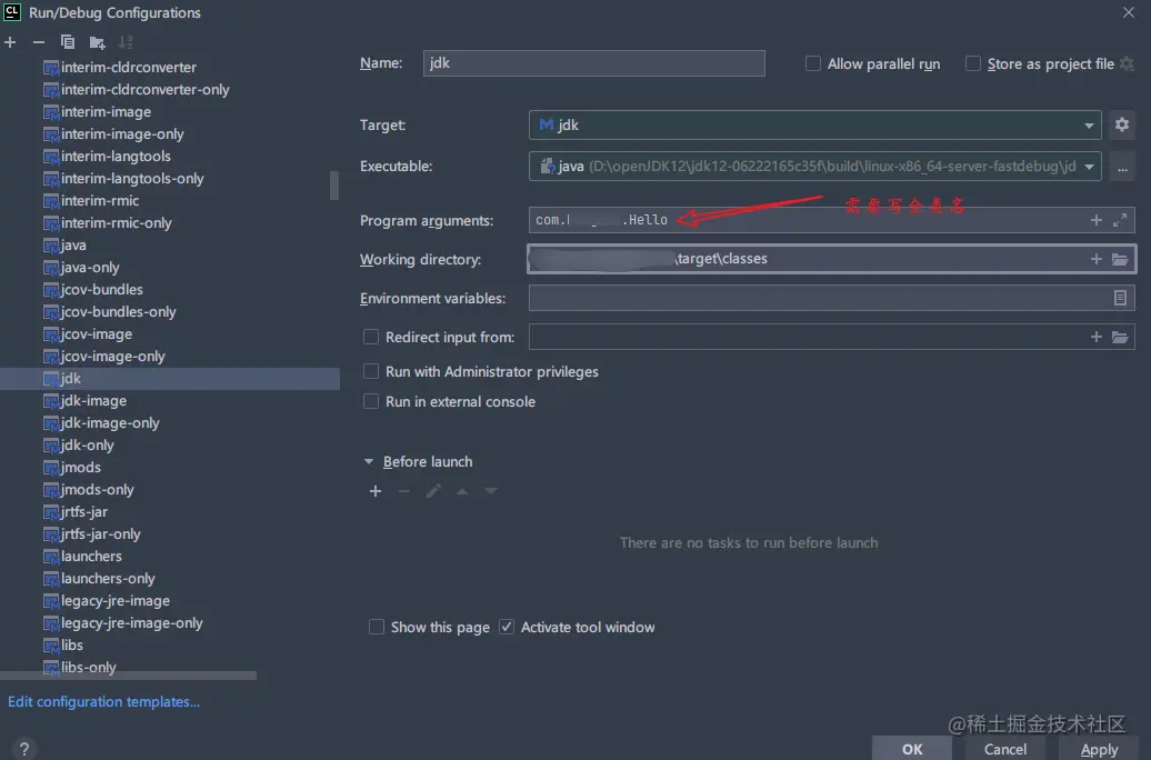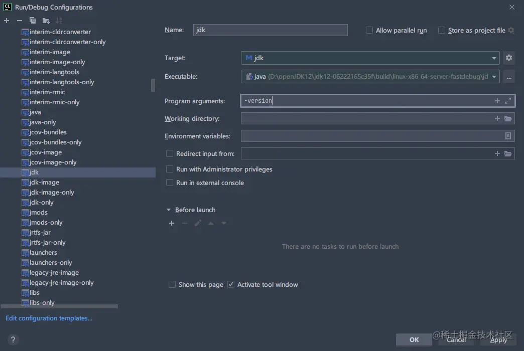 然后选all即可,打开编辑,Executable选择编译出来的java命令,Before launch移除Build