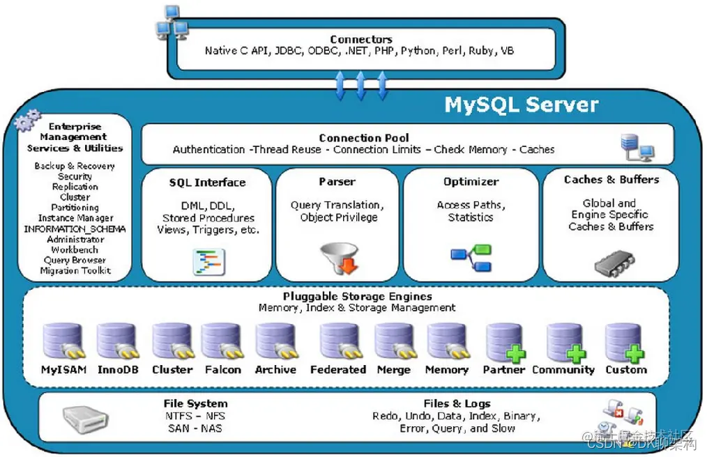 管理工具和服务:系统管理和控制工具,例如备份恢复、Mysql 复制、集群 等