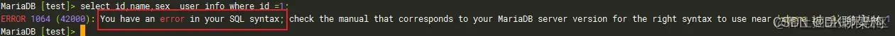 MariaDB [test]> select id,name,sex from user_info where id =1;