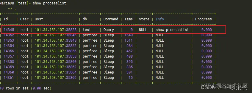 show processlist 命令查看连接,如下