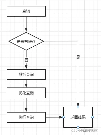 在Server层接受到一个SQL时,如果是查询语句,则首先会查询缓存,mysql会默认将上次SQL执行的语句当做key,结果当做value保存在内存里。如果下次查询直接命中key,则会直接返回客户端。如果没有命中,则会继续执行后面的流程。