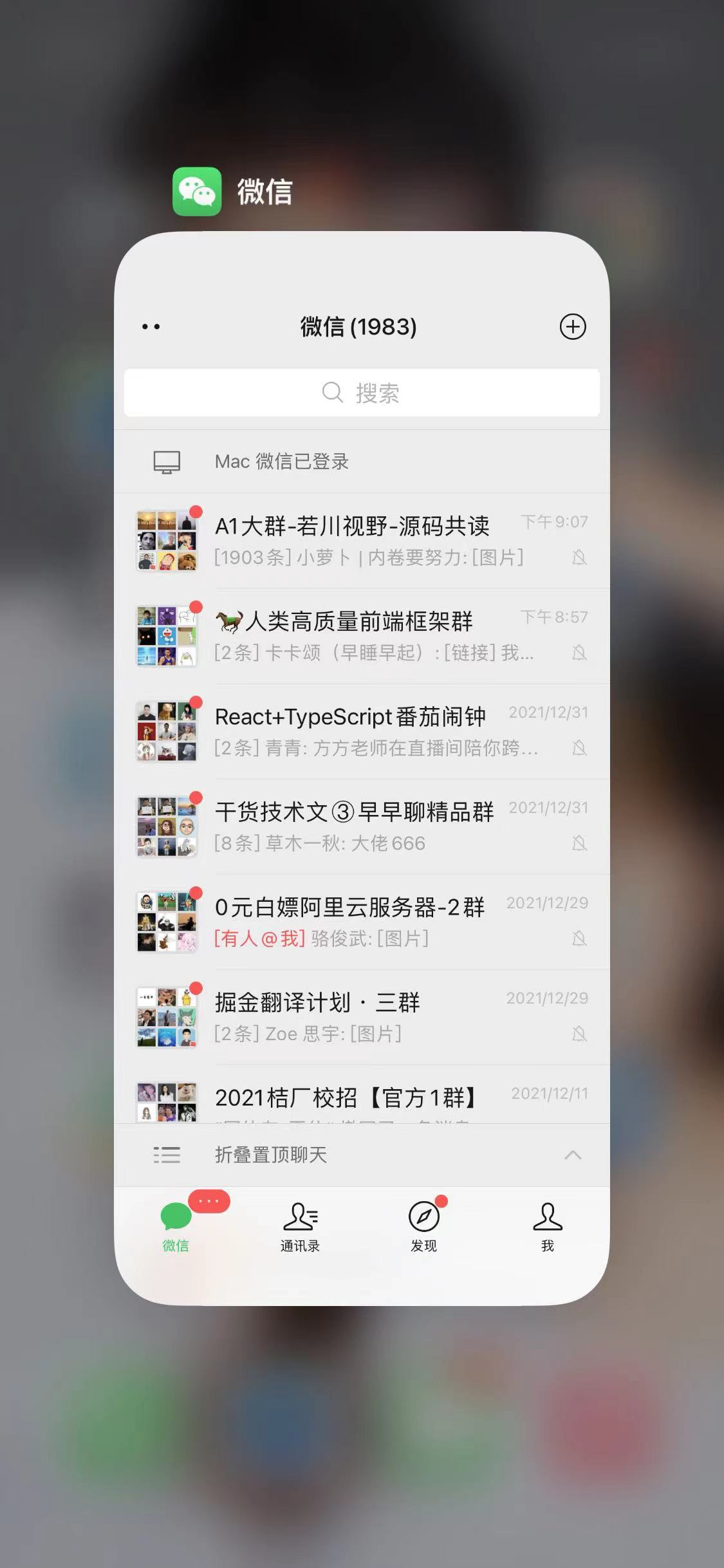首先将手机后台全部清理掉,第一步先把微信打开,回到主页面之后查看后台顺序可以看到: