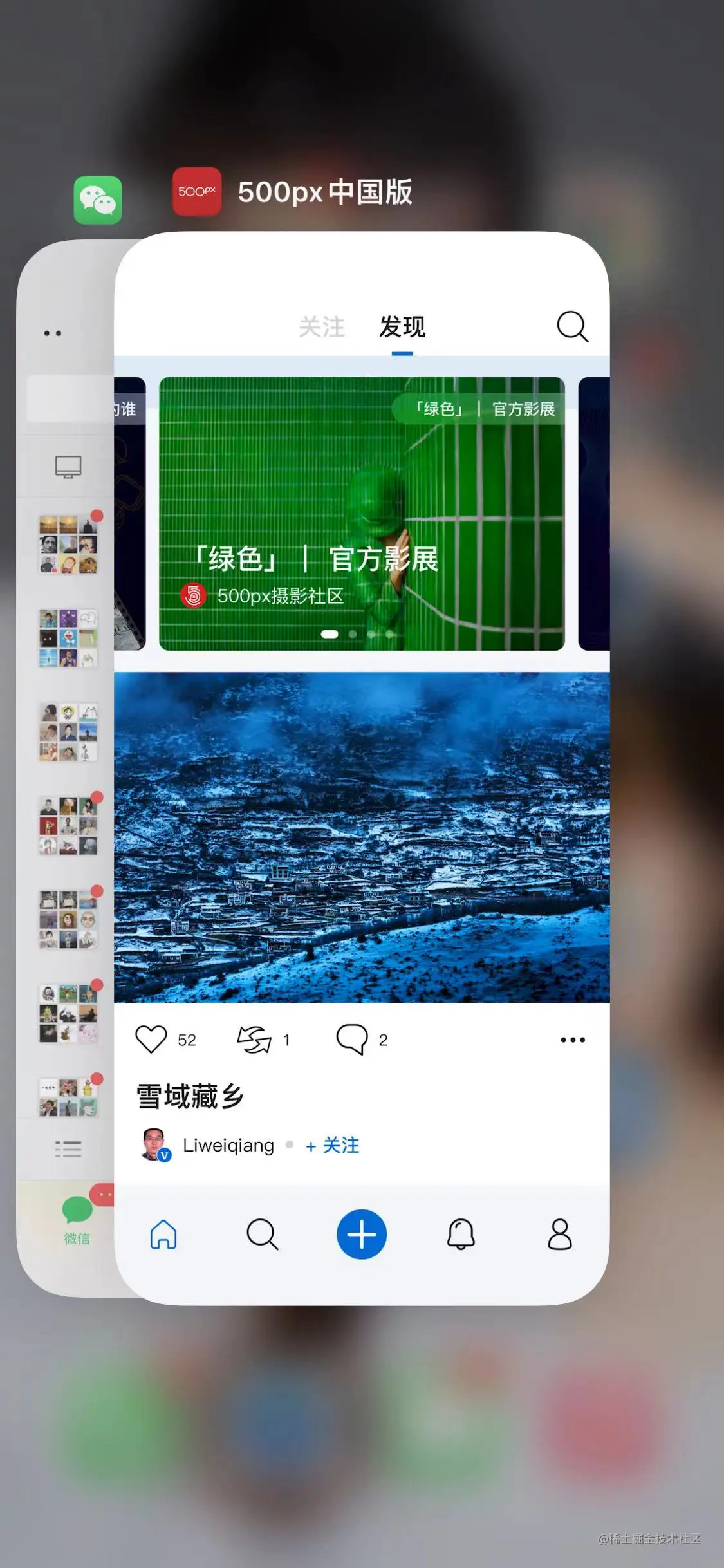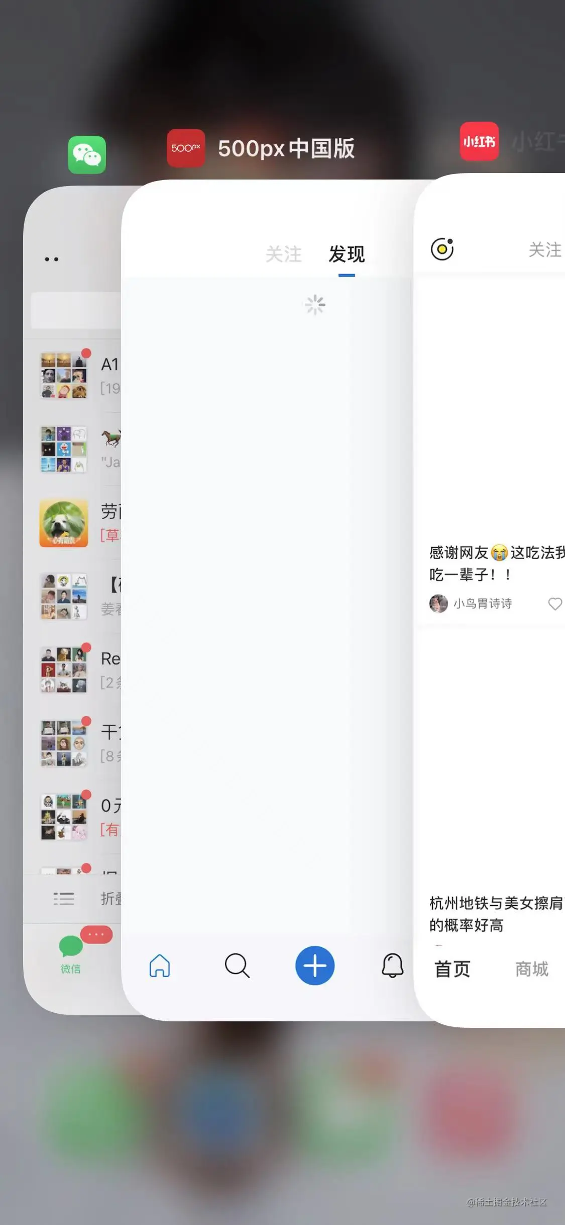 此时500px应用在最前面(最右边),微信在最后面(最左边)