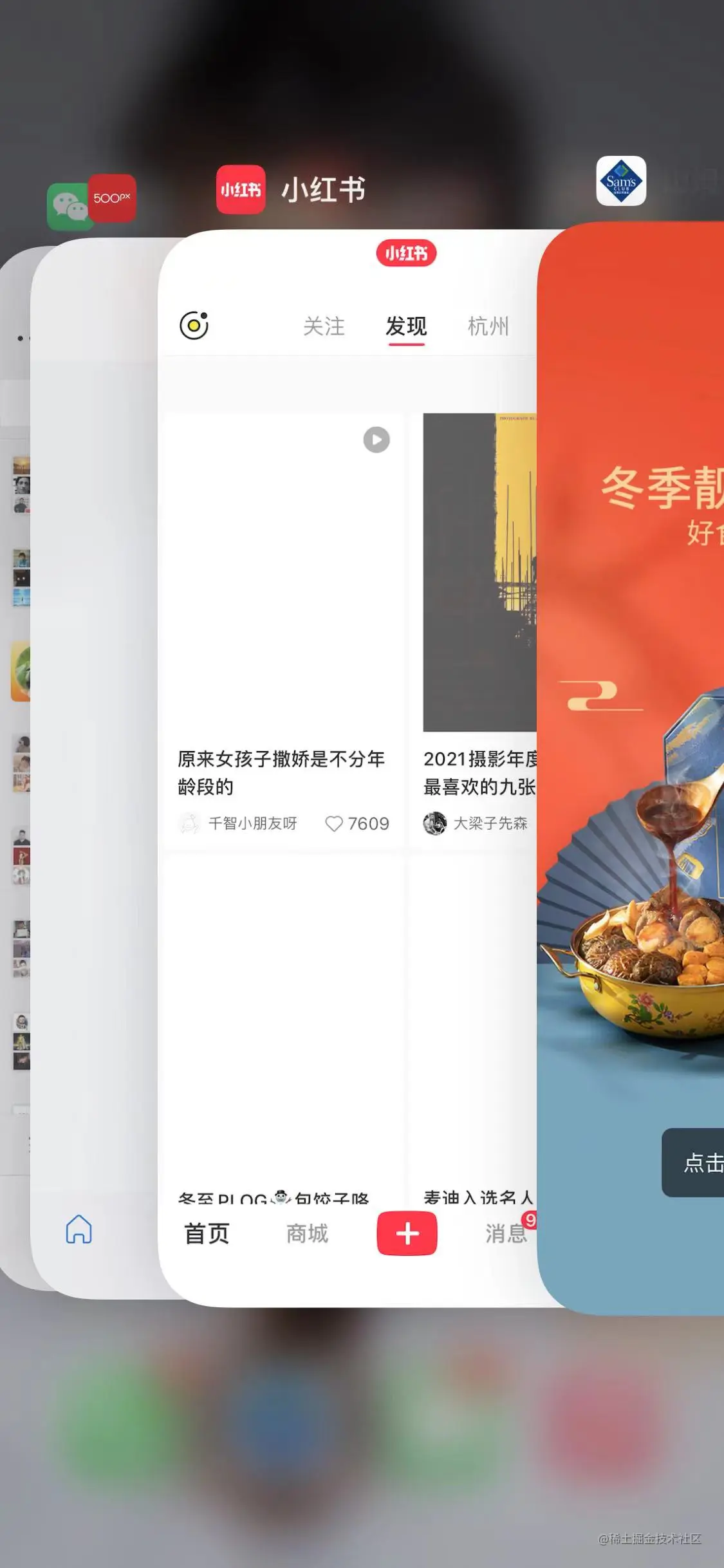 此时小红书在最前面(最右边),微信在最后面(最左边)