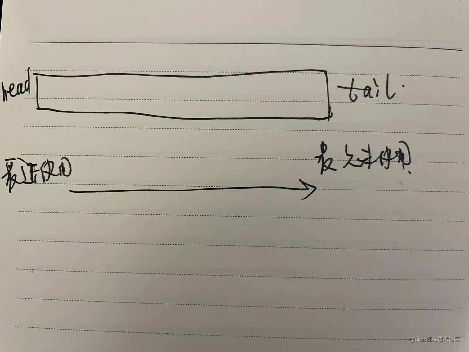 - 每次put数据时,都需要把内容存放到头部,put数据时容量不够时要从尾部删除数据后再将新的数据添加到头部,因此我们需要一个有头有尾且按照顺序保存数据的这样一个数据结构。如下图: