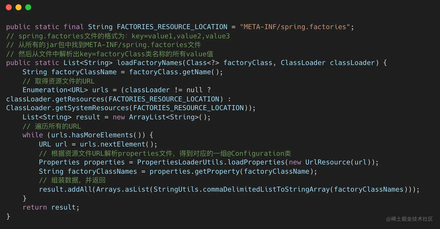 在使用 Spring Boot 中我们会将想要注入 IOC 容器的类将全类限定名写到 META-INF/spring.factories文件中,在 Spring Boot 程序启动的时候就会由 SpringFactoriesLoader 进行加载,扫描每个 jar 包 class-path 目录下的 META-INF/spring.factories 配置文件,然后解析 properties 文件,找到指定名称的配置后返回