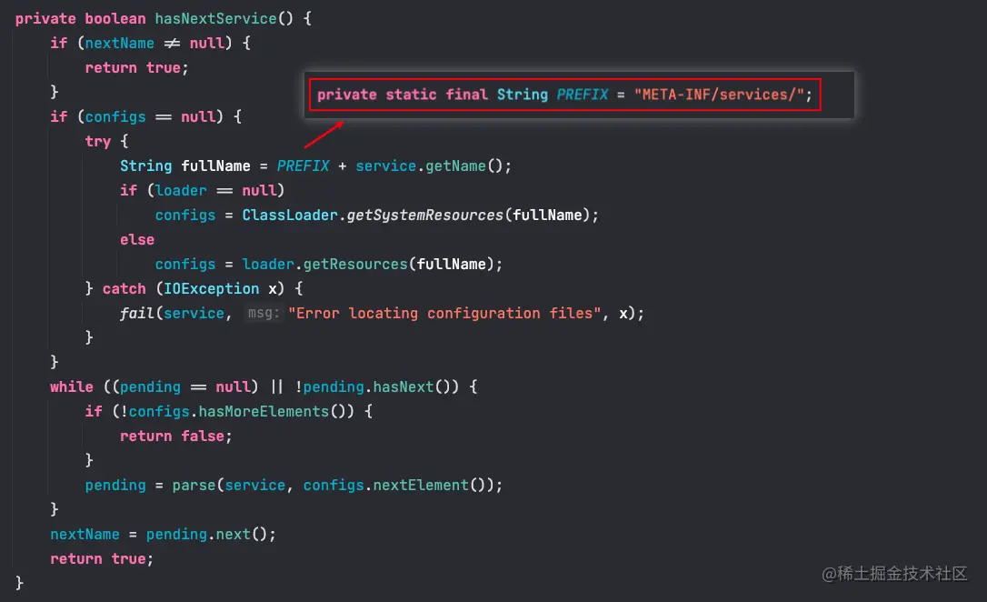 看到该代码的实现顿时豁然开朗了,我们看到了熟悉的目录名 META-INF/services/,该代码会去指定目录下获取文件资源,然后通过上传传入的线程上下文类加载器进行类加载,这样子我们的 SPI 实现类就可以供项目使用了~ 看完不得不感叹 妙啊~