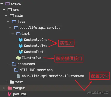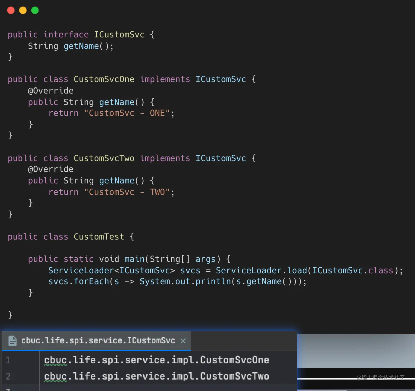 ICustomSvc:服务提供接口(也就是 SPI)CustomSvcOne/CustomSvcTwo:实现者(这里直接在一个项目中简单实现,也可以通过 jar 包导入的方式实现)cbuc.life.spi.service.ICustomSvc:配置文件