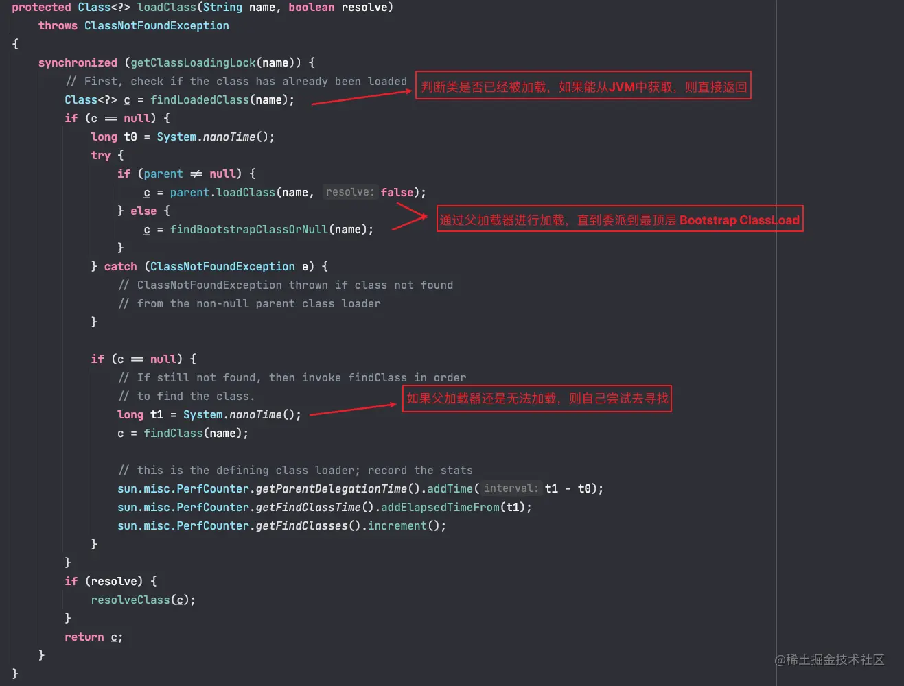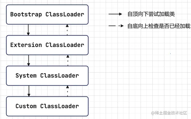 当一个类加载器收到加载类的任务时,会先交给自己的父加载器去完成,一级一级往上,因此最后都会传递到 Bootstrap ClassLoader 进行加载,只有当父加载器无法完成加载任务的时候,才会尝试自己进行加载
