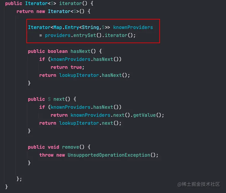 可以看到有个关键的缓存,该缓存存储 provider,每次操作的时候都会去该缓存中查找,如果存在则返回,否则采用 LazyIterator 进行查找,我们进行进入到LazyIterator类中查看如何实现,由于该类代码过长,我们直接截取关键代码,有兴趣的同学可以自行查看完整代码: