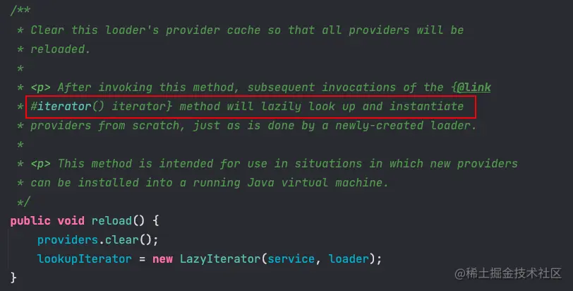 这里将注释一起截取出来,我们可以看到这句话 方法将惰性查找实例化,说明了上述说到实现 Iterable 接口的用处,我们这里可以先点进 iterator() 方法查看是如何实现的
