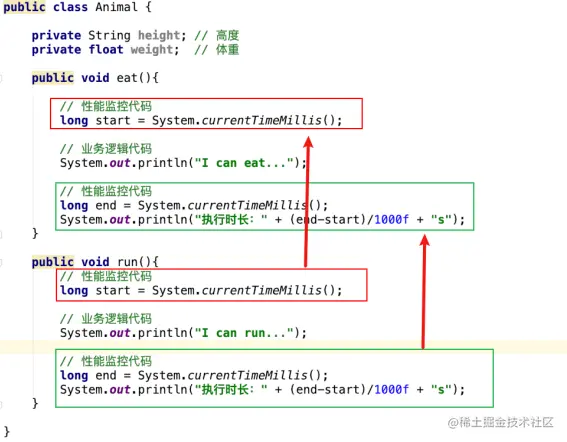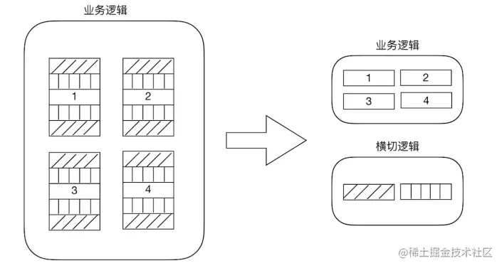 在上面的代码中,多个方法都出现了相同的代码(可以称之为横切逻辑代码)。这部分代码不仅重复,而且跟业务逻辑没有关系但是混杂在一起。这时AOP出现了,它提供了横向抽取机制,将这部分横切代码和业务逻辑代码分开。